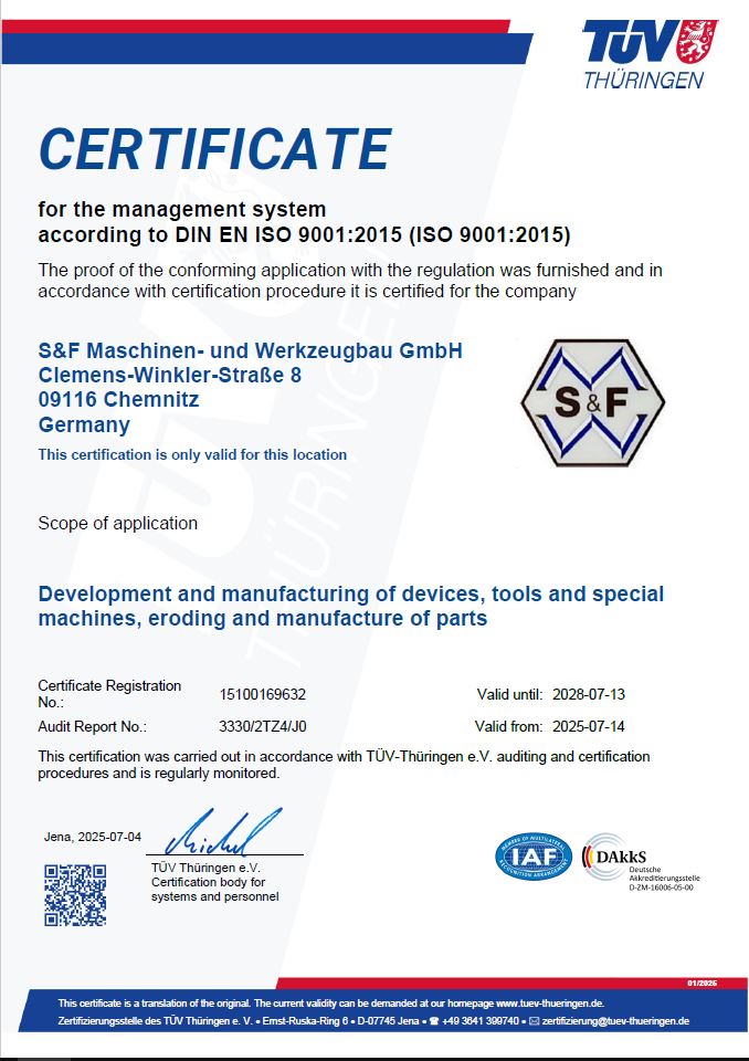 As the controller, the S&F Maschinen- und Werkzeugbau GmbH has implemented numerous technical and organizational measures to ensure the most complete protection of personal data processed through this website. However, Internet-based data transmissions may in principle have security gaps, so absolute protection may not be guaranteed. For this reason, every data subject is free to transfer personal data to us via alternative means, e.g. by telephone.